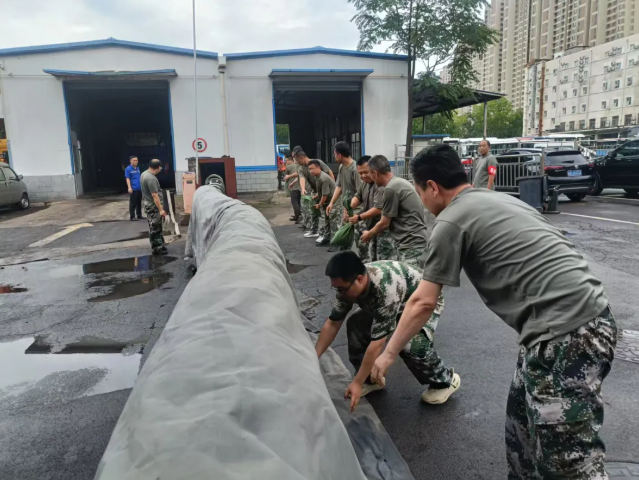 本次演练模拟因受持续强降雨影响,导致公司西院积水严重,修理厂设施设备面临水淹风险的场景。公司防汛指挥领导小组迅速启动防汛应急响应,20名防汛应急抢险队员迅速集结,按照预案分工展开行动。应急抢险队员第一时间奔赴现场,利用修理厂电动栅栏门为支撑,在上面铺设防水雨布,再用沙袋将雨布压实固定筑起防水堤,防止积水继续向修理厂院内倒灌;同步开展排水管线铺设作业,快速搭建应急排水设施,将修理厂院内积水排出。